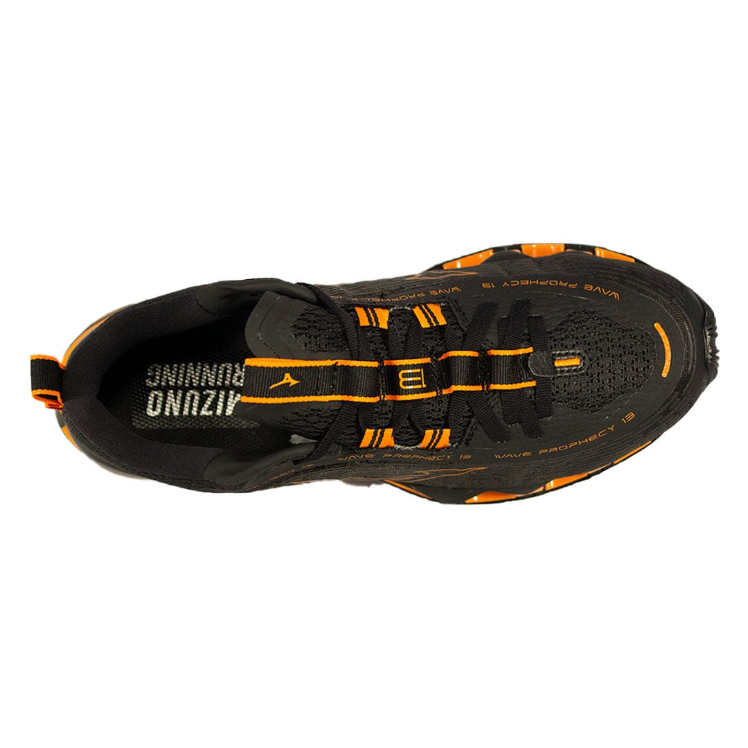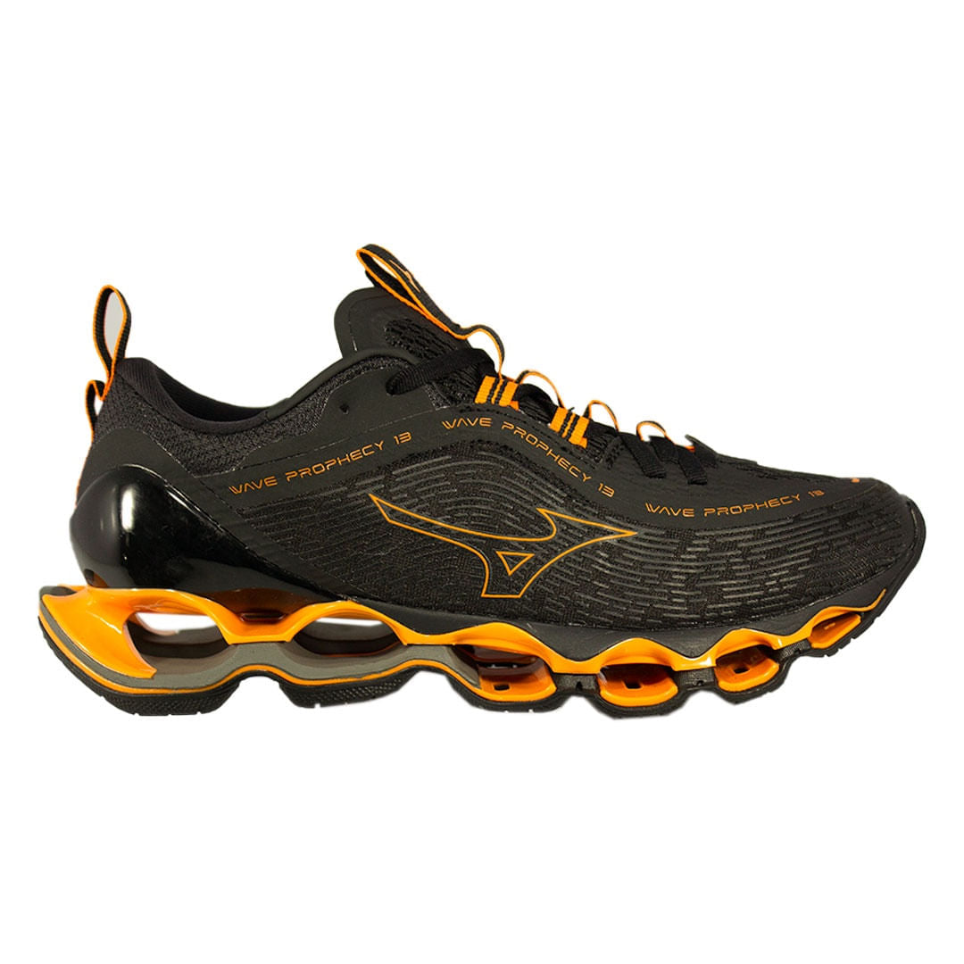 • O Wave Prophecy 13 é a nova versão da consagrada franquia da Mizuno. O cabedal confeccionado em mesh de monofilamento resistente proporciona respirabilidade, trazendo maior conforto para o pé. A entressola é feita de EVA com tecnologia U4ic, que garante leveza e amortecimento para o produto, somada a placa Infinity Wave, dando mais estabilidade ao produto. Possui placa Wave, tecnologia consagrada da Mizuno, que proporciona amortecimento e estabilidade para o atleta. A sola conta com tecnologia X10um composto de borracha com carbono que garante mais tração e maior durabilidade.