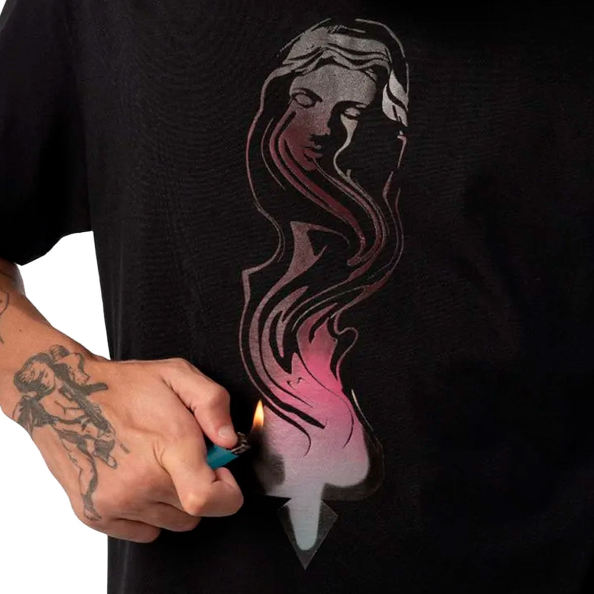 • O destaque da peça está na estampa exclusiva localizada na parte frontal, representando a arte da MCD com o tema "Santa Desintegrando". O design apresenta uma mistura de elementos surrealistas e simbólicos, combinando cores e formas de maneira intrigante, típica da identidade visual da marca.