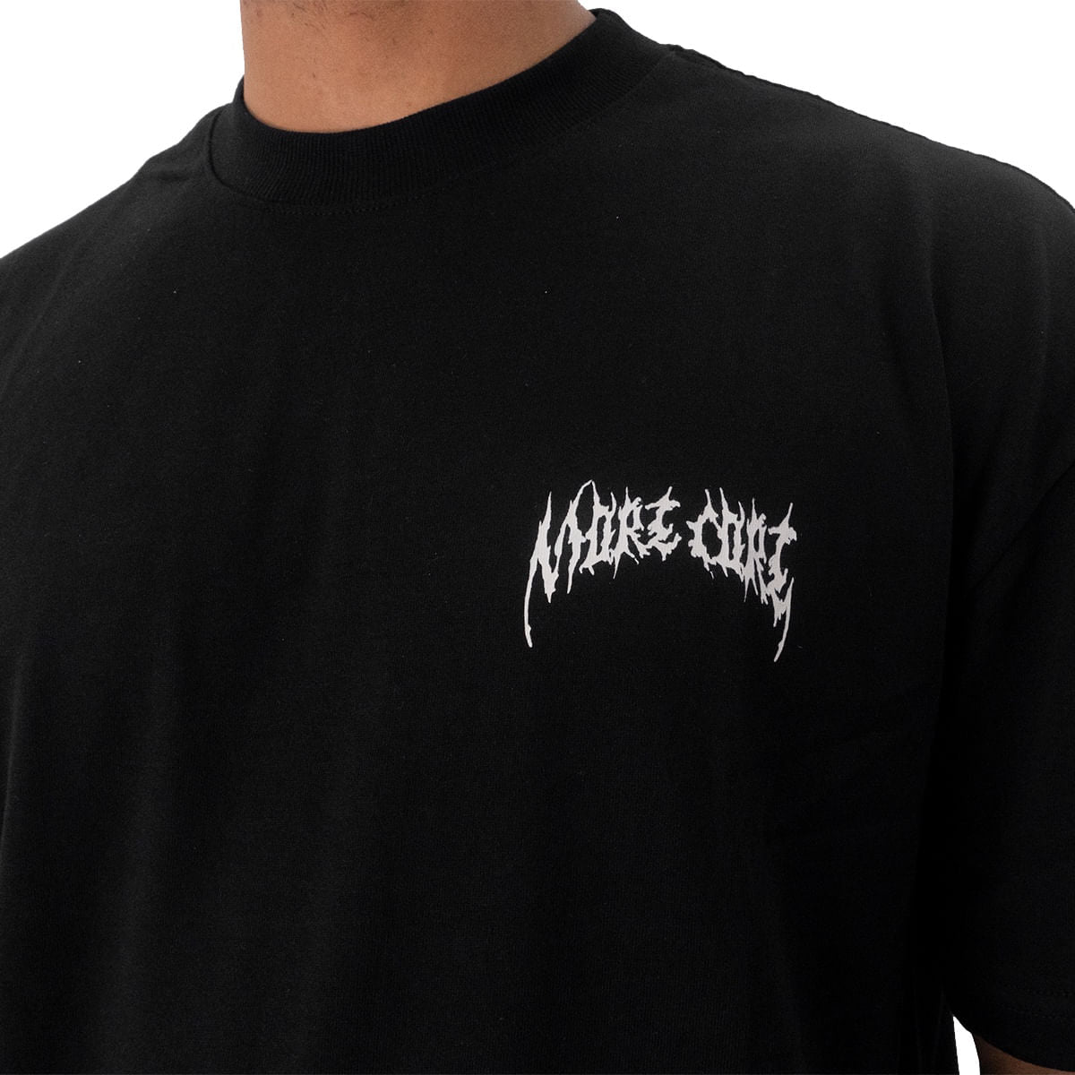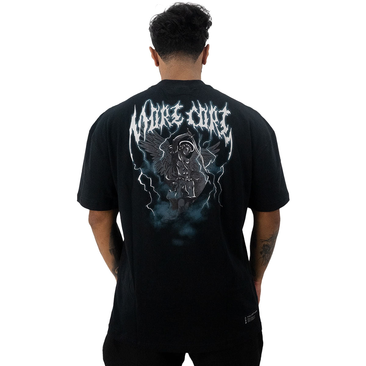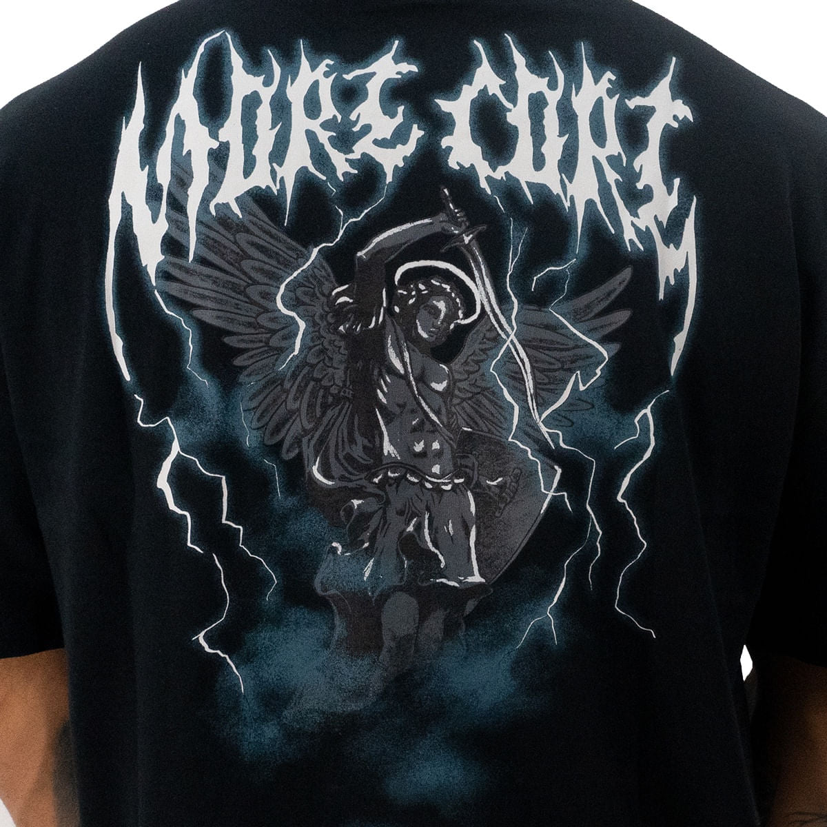 Com uma imponente ilustração de anjo em estilo dark e relâmpagos com a escrita More Core, a estampa traseira domina o visual e carrega a assinatura gráfica inconfundível da MCD.