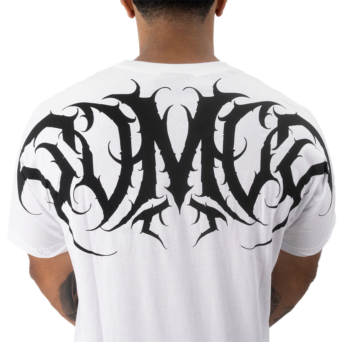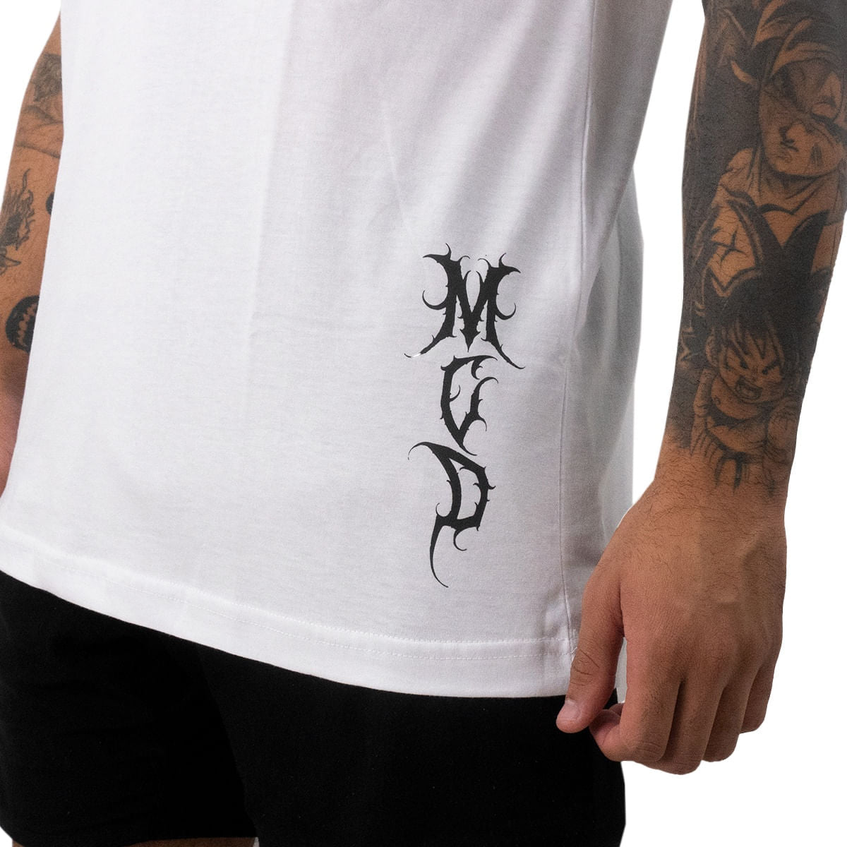 Na parte da frente, o logo "MCD" aparece na barra lateral em estilo gótico discreto. Já nas costas, o destaque vai para a estampa dark que ocupa toda a parte superior, criando um visual marcante e expressivo.