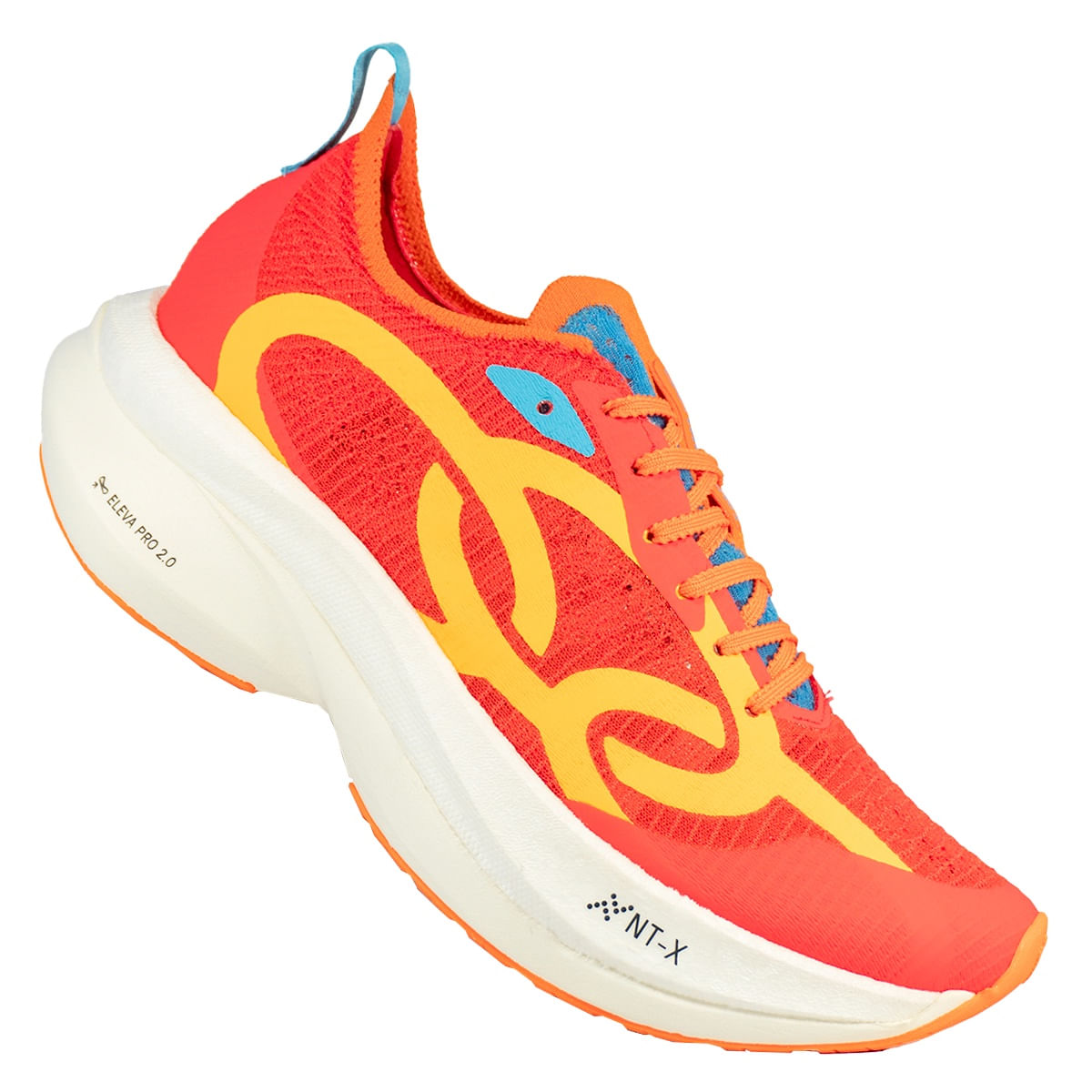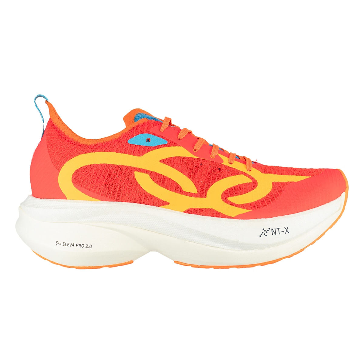 • A combinação da tecnologia NT-X (camada superior) com o composto Eleva Pro 2.0 (camada inferior) entrega amortecimento em dois estágios. O NT-X, expandido com nitrogênio, garante absorção de impacto sem comprometer a leveza, enquanto o Eleva Pro 2.0 oferece mais resposta e resiliência, auxiliando em provas de longa duração e alta exigência física.
