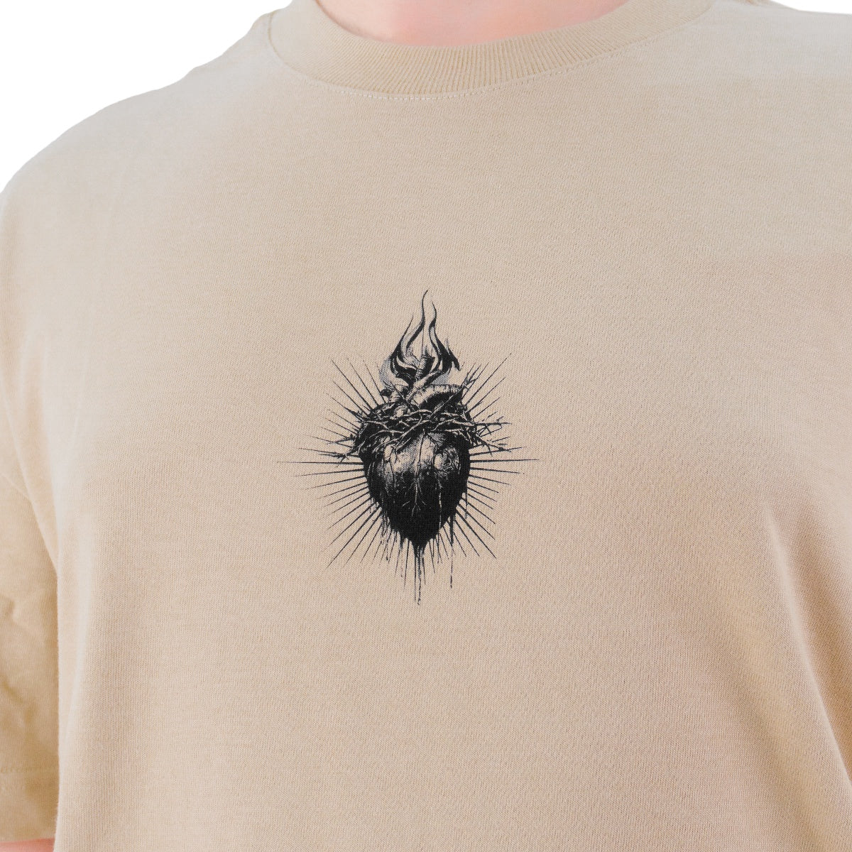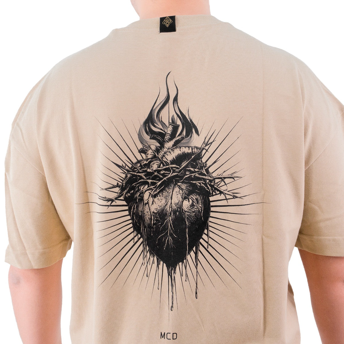 A estampa frontal Sagrado Coração centralizada traz impacto logo de início, enquanto a estampa grande nas costas reforça toda a personalidade da MCD — presença marcada de frente e de costas.