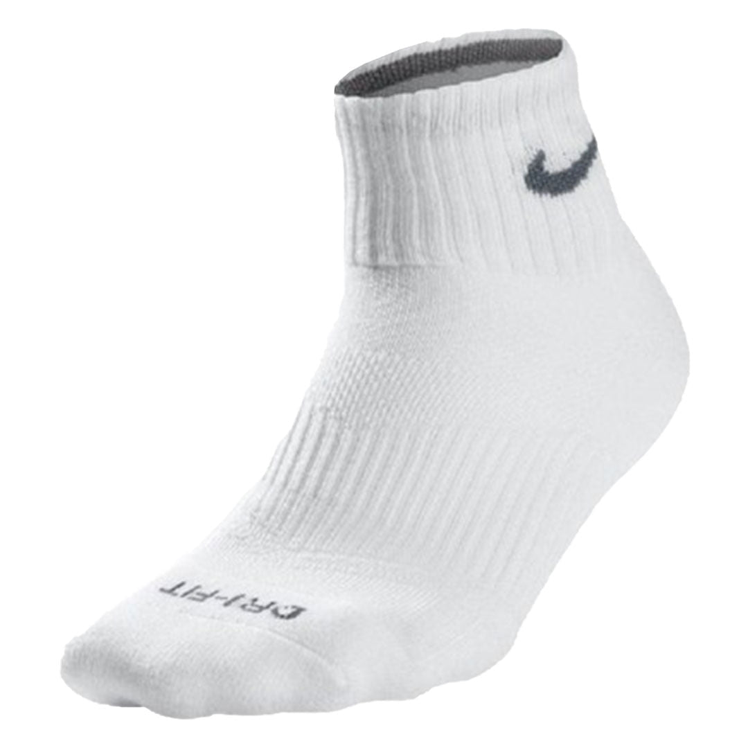 • Meia Nike Sri-Fit Cotton Cush branca, com bordados da marca e estilo soquete, ideal para uso com sapatos esporte.
